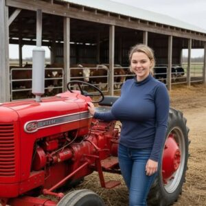 “Hot ride! In a pink summer dress on the John Deere at 35°C