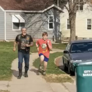 For three months, I watched from my kitchen window as a stranger in a leather vest jogged beside my thirteen-year-old son, Connor, every morning at exactly 6…