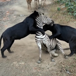 Two Black Panthers Attack a Zebra as Deer Watch Nearby