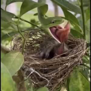 A shocking moment from the wild has been captured in this image, where a green snake has reached a nest of tiny baby birds hidden among the…