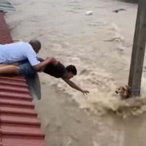 A dramatic scene has been captured in a flood-affected area, where two men risk their lives to save a dog trapped in fast-moving water. The footage shows…