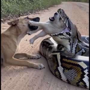 A shocking scene has been captured on a remote dirt road, where a dog bravely confronts a giant python in a desperate attempt to save its puppy….