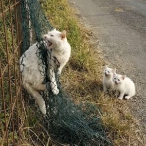 touching and alarming scene has been captured near a rural road, where a white cat became trapped in a mesh fence. The animal appears distressed, struggling to…