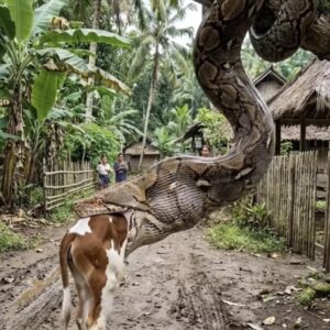 A terrifying scene has been captured in a rural tropical area, where a massive snake attacked a calf in the middle of a village road, leaving locals…
