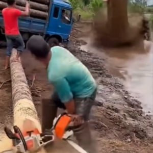 A scene that looks straight out of a movie took place in a rural area, where several workers were cutting logs near a muddy road. As one…