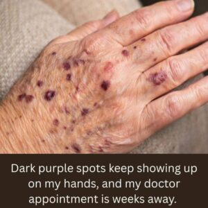 Dark purple spots keep showing up on my hands, and my doctor appointment is weeks away. What should I do in the meantime?