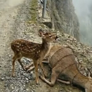 Unusual and disturbing footage is circulating on social media, showing a large snake coiled around a hen while her small chicks remain close nearby. The images were reportedly captured near a roadside and have sparked strong reactions due to the clear danger and frightening nature of the scene.