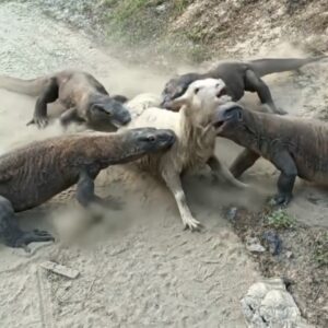 A shocking scene has been captured showing several giant lizards, similar to Komodo dragons, attacking a sheep on a muddy road. In the image, at least four…