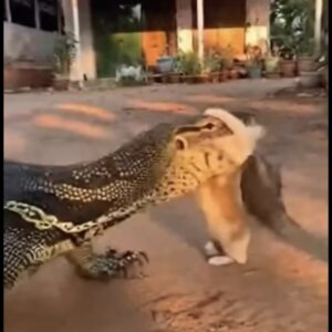 A shocking yet touching scene has been captured in a backyard, where a cat bravely confronts a large reptile to save its young. The footage shows the…
